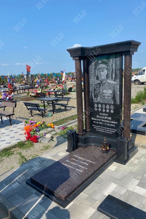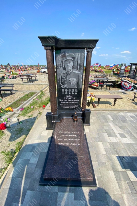 Памятник для военного выполнен из черного карельского и коричневого дымовского гранита. Композицию дополняют классические колонны, художественная гравировка и лампада у основания.